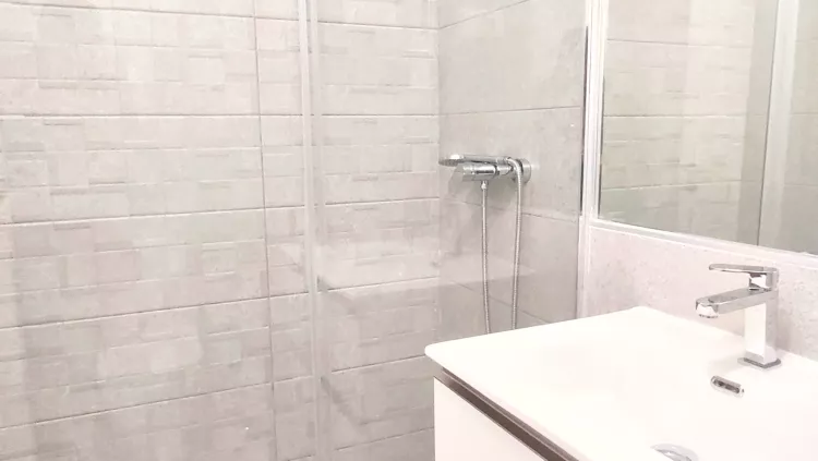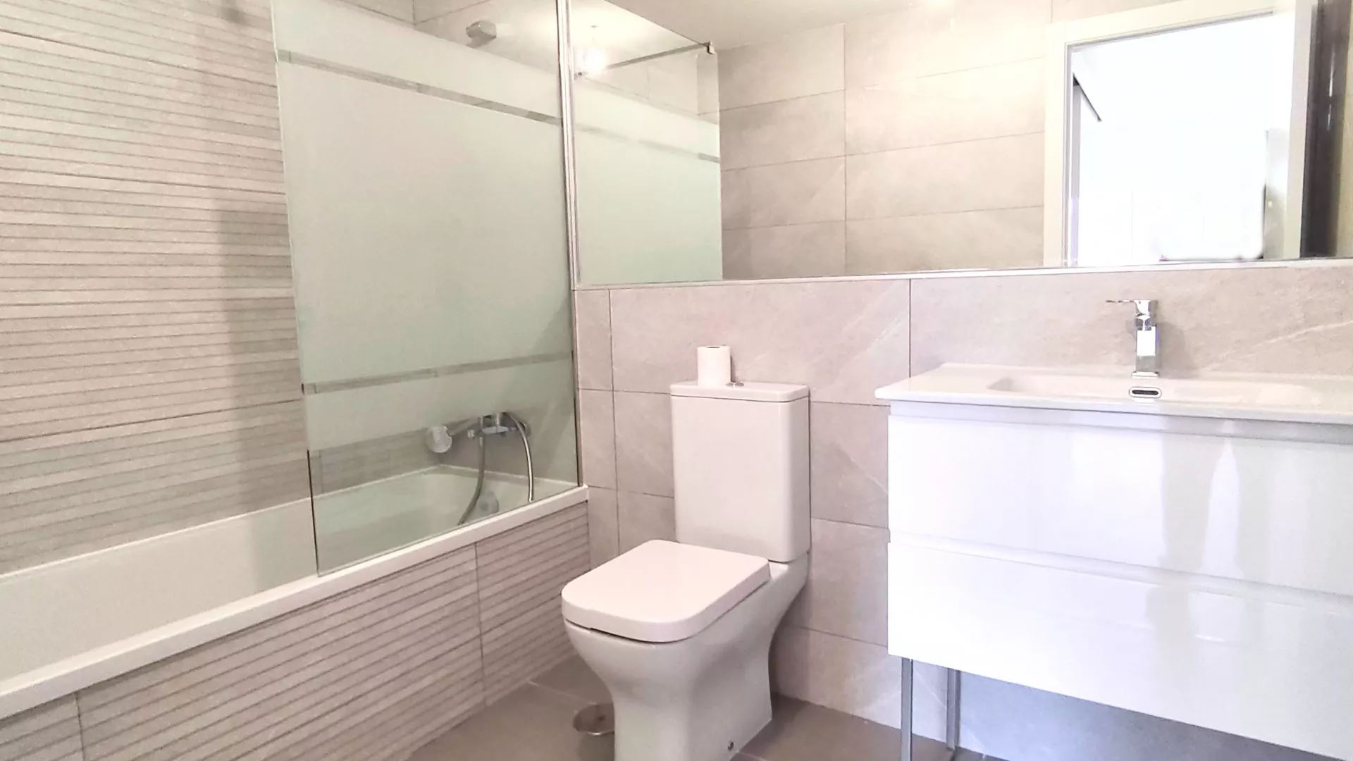 El piso cuenta con dos dormitorios, uno de ellos con baño en suite con bañera, y un segundo baño completo con plato de ducha, ofreciendo comodidad y funcionalidad en el día a día.