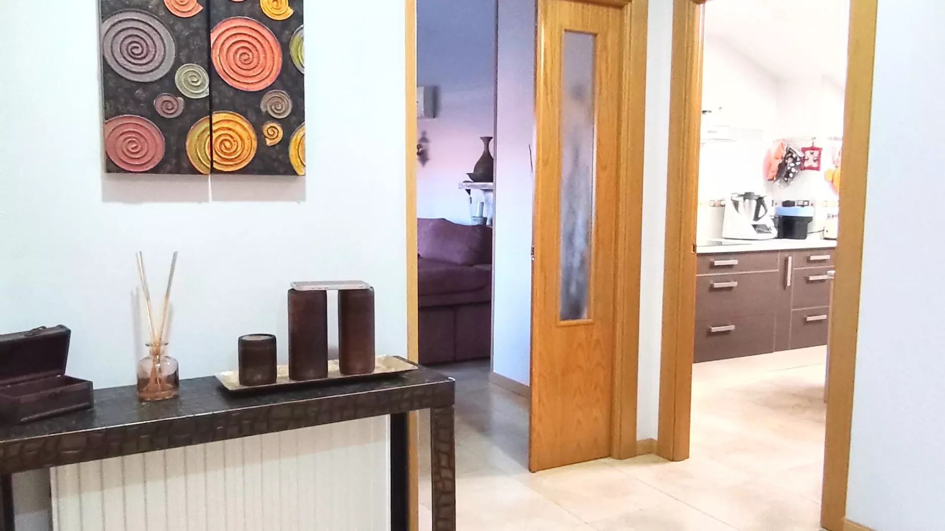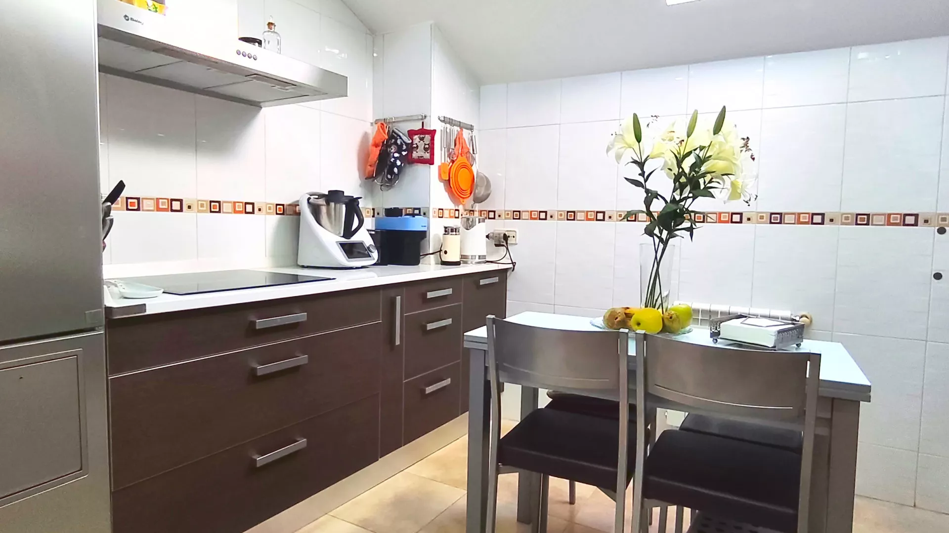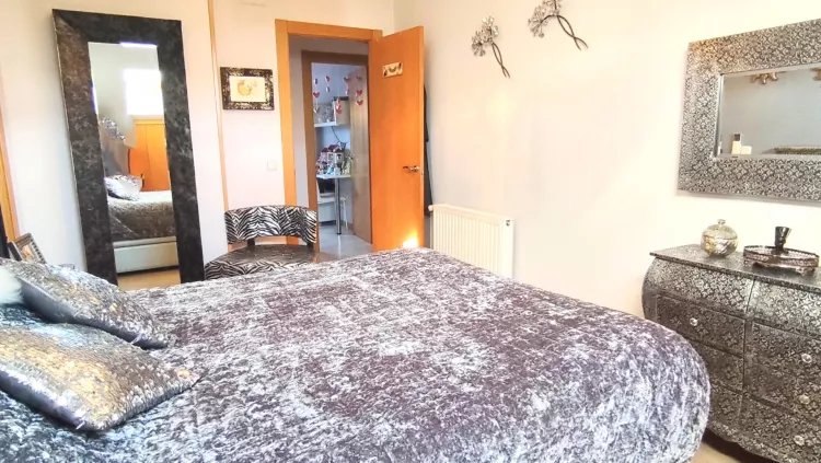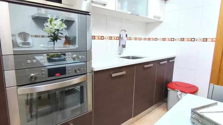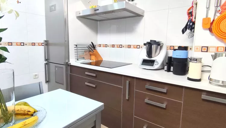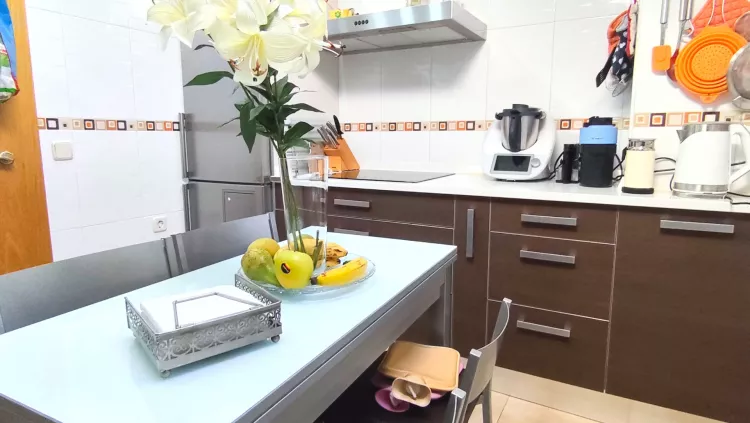 A través del distribuidor accedemos a la cocina, totalmente equipada con electrodomésticos, funcional y bien distribuida. La zona de descanso se compone de tres dormitorios, destacando el dormitorio principal, que dispone de aire acondicionado con bomba de calor y baño privado en suite. Además, la vivienda cuenta con un segundo baño completo y un práctico cuarto de lavandería independiente.