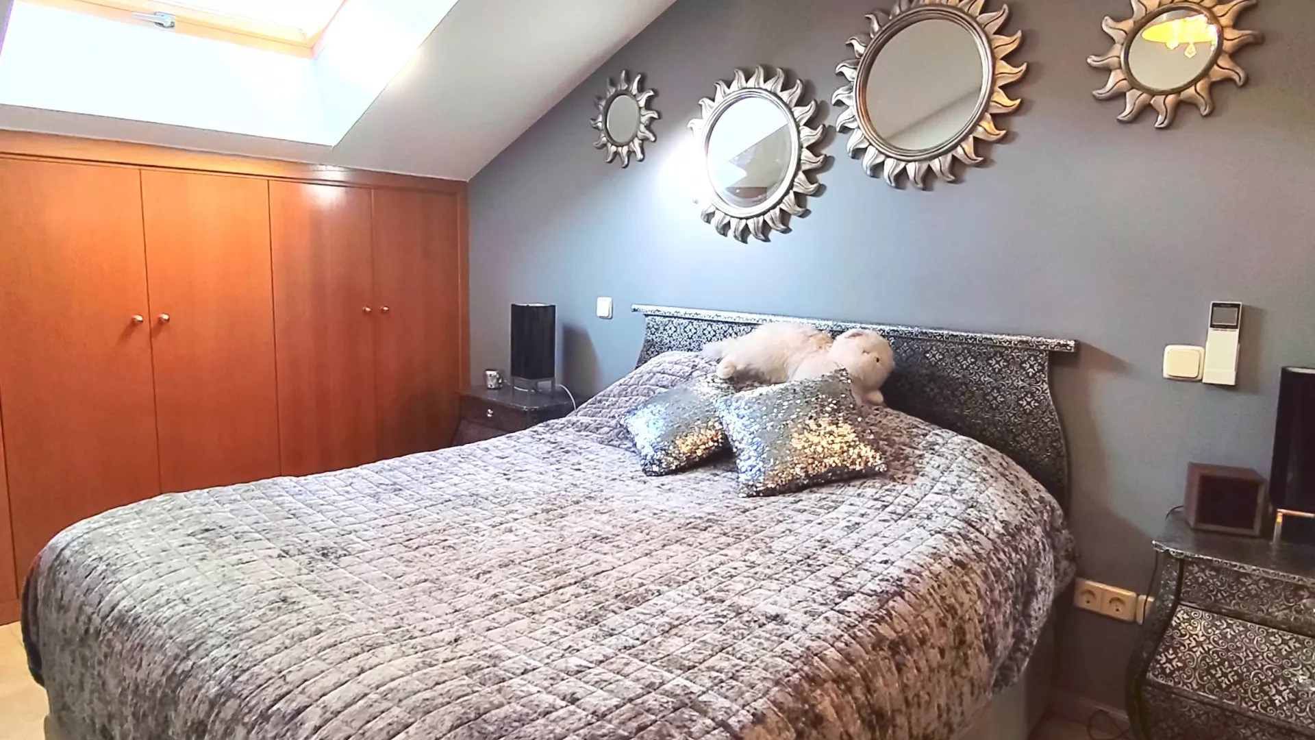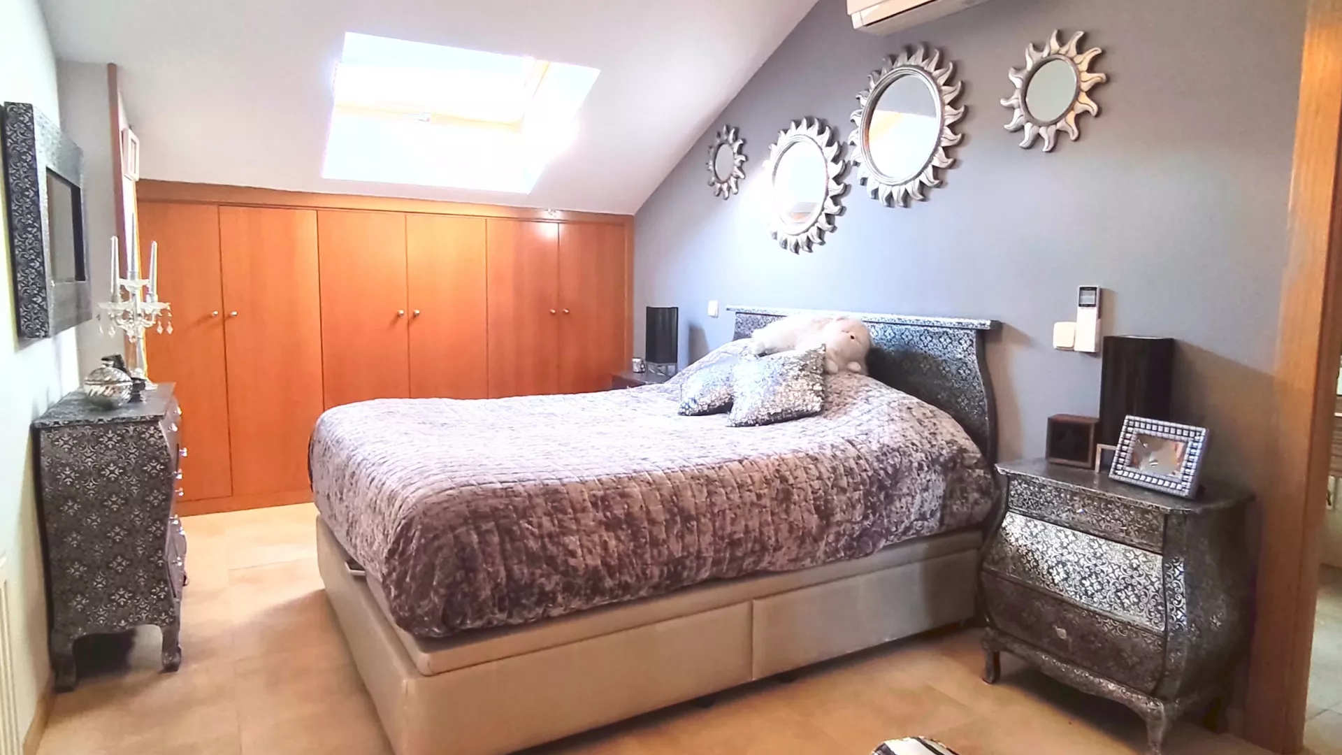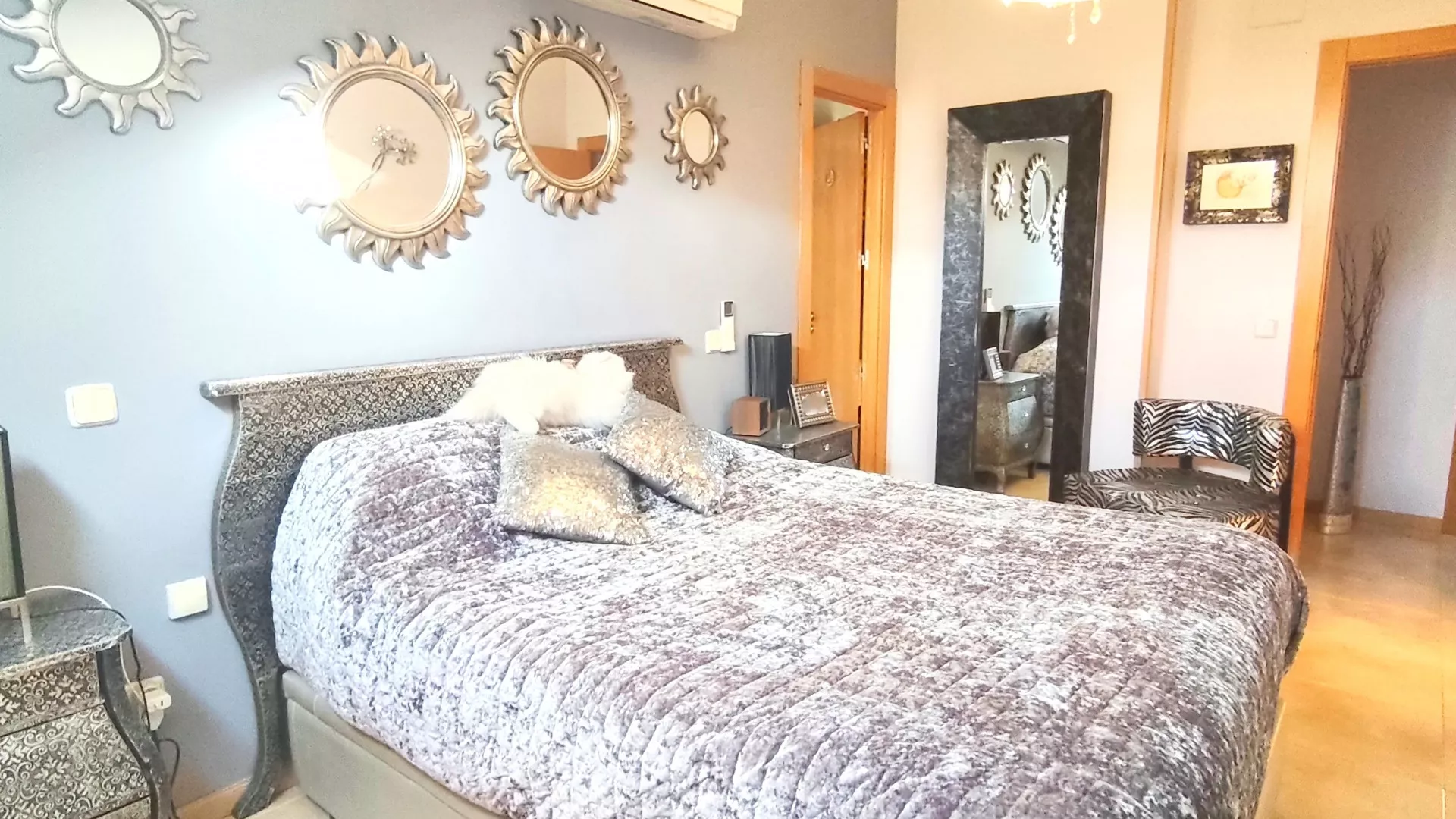A través del distribuidor accedemos a la cocina, totalmente equipada con electrodomésticos, funcional y bien distribuida. La zona de descanso se compone de tres dormitorios, destacando el dormitorio principal, que dispone de aire acondicionado con bomba de calor y baño privado en suite. Además, la vivienda cuenta con un segundo baño completo y un práctico cuarto de lavandería independiente.